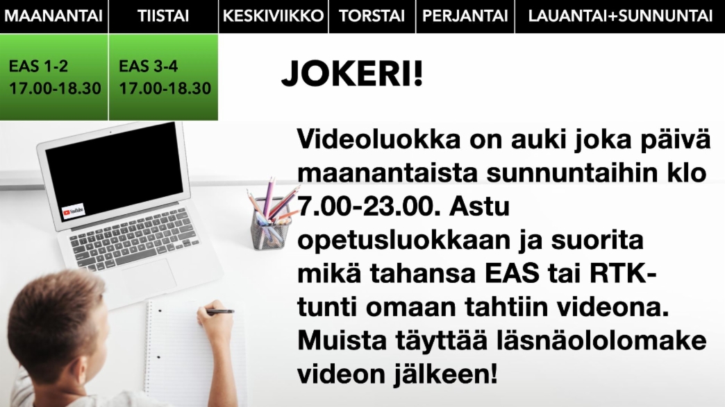 Samoin RTK-koulutuksen 4 teoriatuntia voit suorittaa oletusarvoisesti verkkotunteina tai (pyytäessäsi ennen verkkotunti suorituksiasi) vaihtoehtoisesti live-tunteina virtuaaliluokassa. Kysythän lisää – Tervetuloa!
