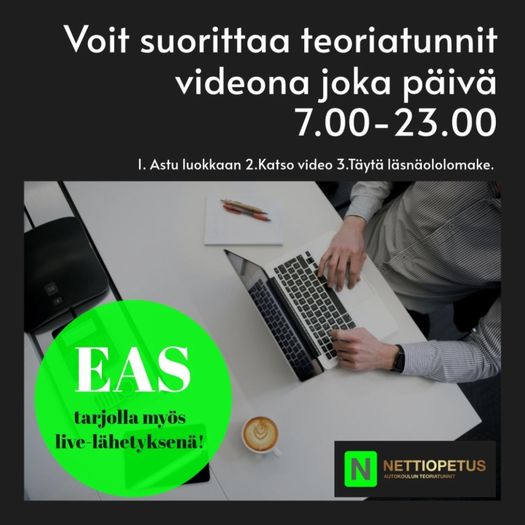 EAS-koulutuksen 4 teoriatuntia voit suorittaa oletusarvoisesti verkkotunteina Webautossa tai (pyytäessäsi ennen verkkotunti suorituksiasi) vaihtoehtoisesti live-tunteina virtuaaliluokassa opettajan ja muiden oppilaiden kanssa. Ilmoittautuessasi voit samalla tilata käyttöösi myös tarvittavan oppimateriaalit ja oppimisympäristöt. Ensimmäisen ajokortin suorittajan koulutus (EAS) tulee suorittaa opetusluvalla ennen ajotuntien aloittamista ja todistus tulee olla mukana ajotunneilla.
